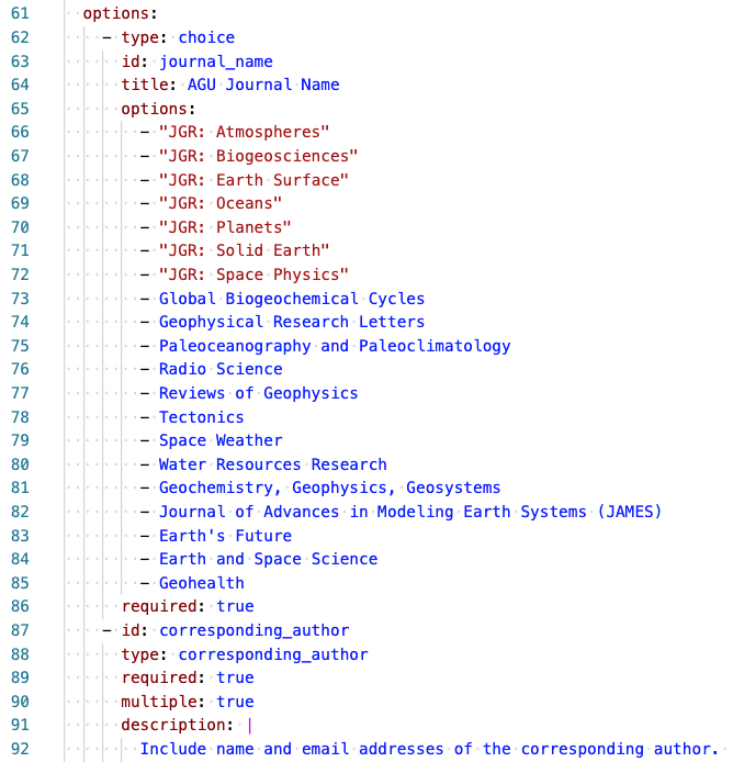 Here is an additional example, of how the AGU2019 template specifies two of these fields to set the journal name and request information on one or more corresponding authors.