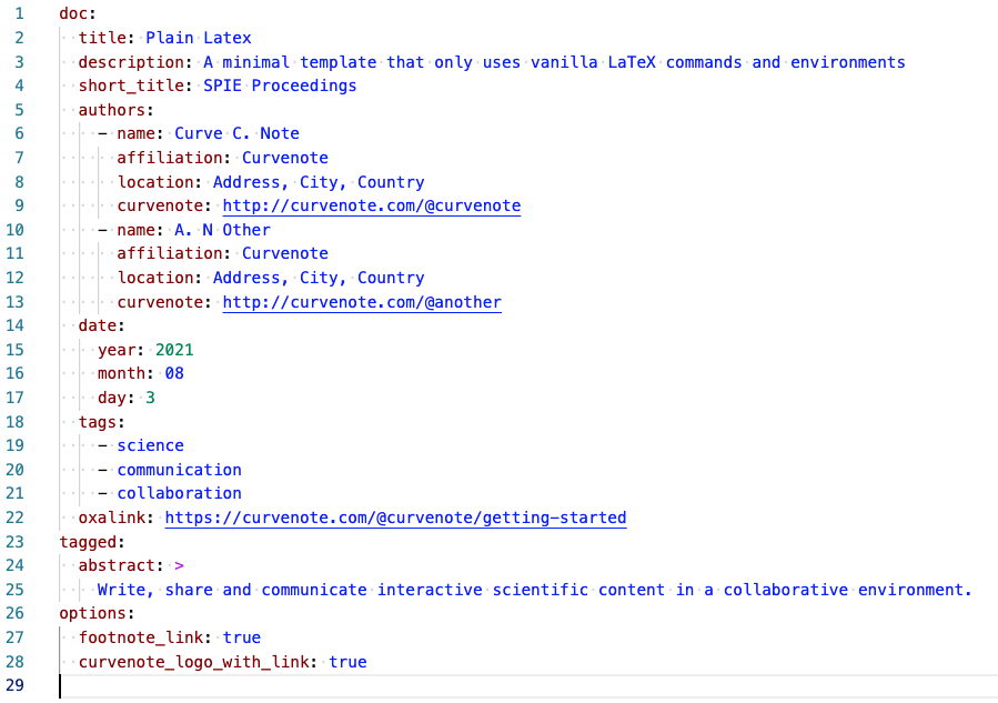 This is where the template content, custom commands/environments are defined and pulled together using the template markup. We’ve covered a lot of this in examples above but one additional feature to note is the \input{curvenote.def} command.