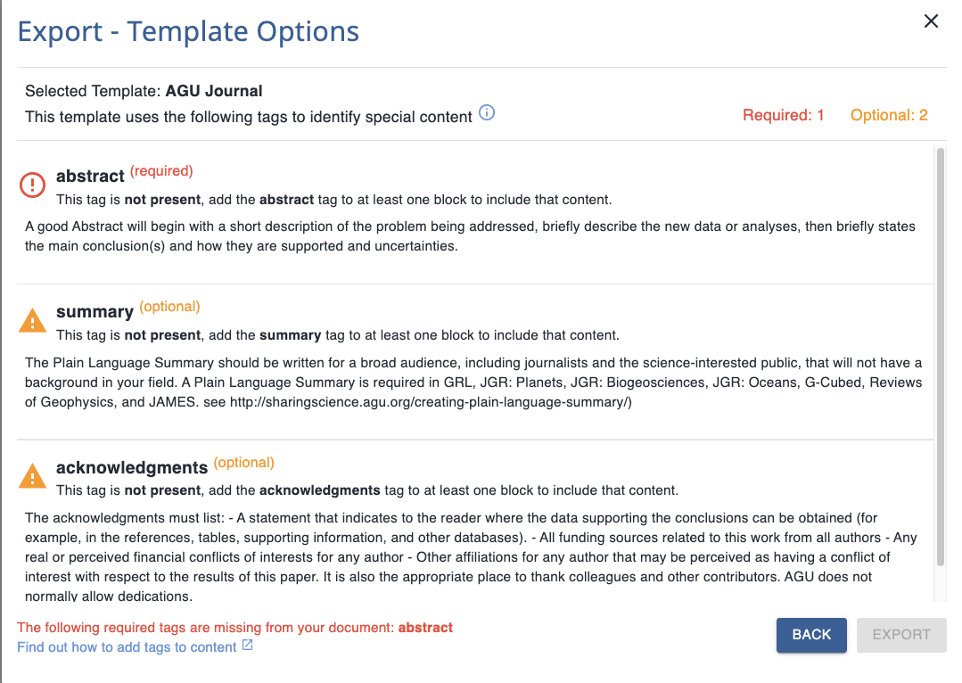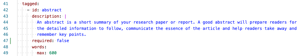 The configuration for the tagged content allows for a description and a word count (character count coming soon!) which will be shown and used in the Curvenote API. This allows very specific guidance about a particular template’s requirements. A piece of tagged content can also be marked as required.
