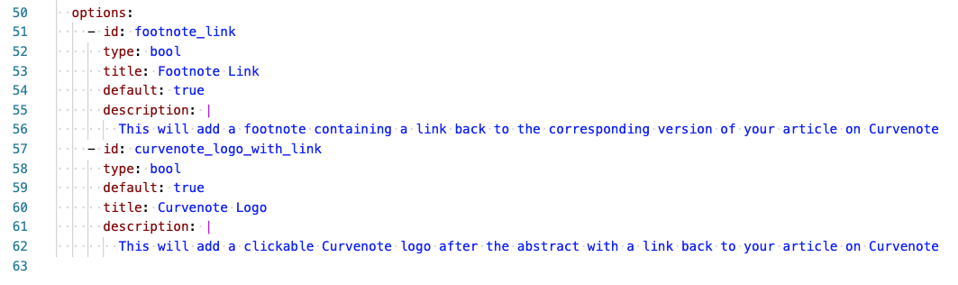 Options are specified with a unique ID and description. Options can also be required or left as optional and the Curvenote UI will enforce that rule. In addition to booleans, options can be of type: str, choice, keywords, corresponding_author.