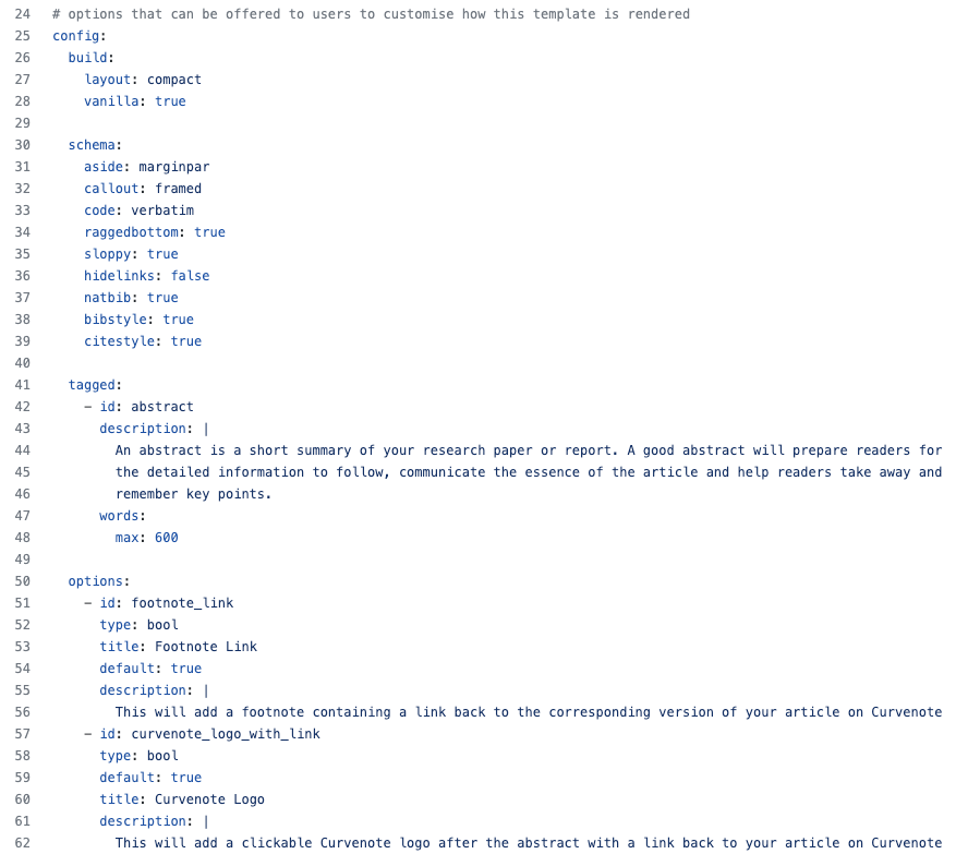 The build command uses a standardized YAML format that we have developed in looking at many different LaTeX templates, this is the format outlined in our open template collection. The structure of the document model used here is prescriptive but configurable via three configuration mechanisms; schema, tagged content and template options — more on this in the next section.