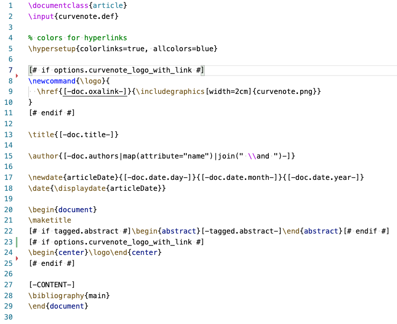 [# if options.a #] Some LaTeX [# endif #]While this is clear, we also have access to the complete Python-like Jinja environment between the[#,#]so you can do things like set persistent variables that remain available elsewhere is the template.Jinja filters - These filters allow typical functional programming style manipulation of data, e.g. line 15, where we expand the list of authors
