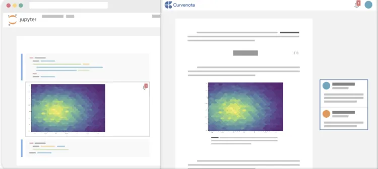 Both Jupyter and GitHub are popular within open-source coding and research communities. Jupyter, built within an open-source community, provides a set of tools for scientific computing that have become one of the go-to resources for teaching and learning scientific programming. GitHub’s platform provides collaborative features around version control in many open-source communities. Curvenote is designed to integrate directly with Jupyter, to maintain an active link between research code and the resulting outputs, even when they appear outside of a Jupyter environment. The collaboration and version control features within Curvenote are built specifically for Jupyter notebooks, overcoming many issues of versioning notebooks in Git. Curvenote presents an approachable alternative to sharing and collaborating on scientific work for those not familiar with code development, or who may find GitHub intimidating.