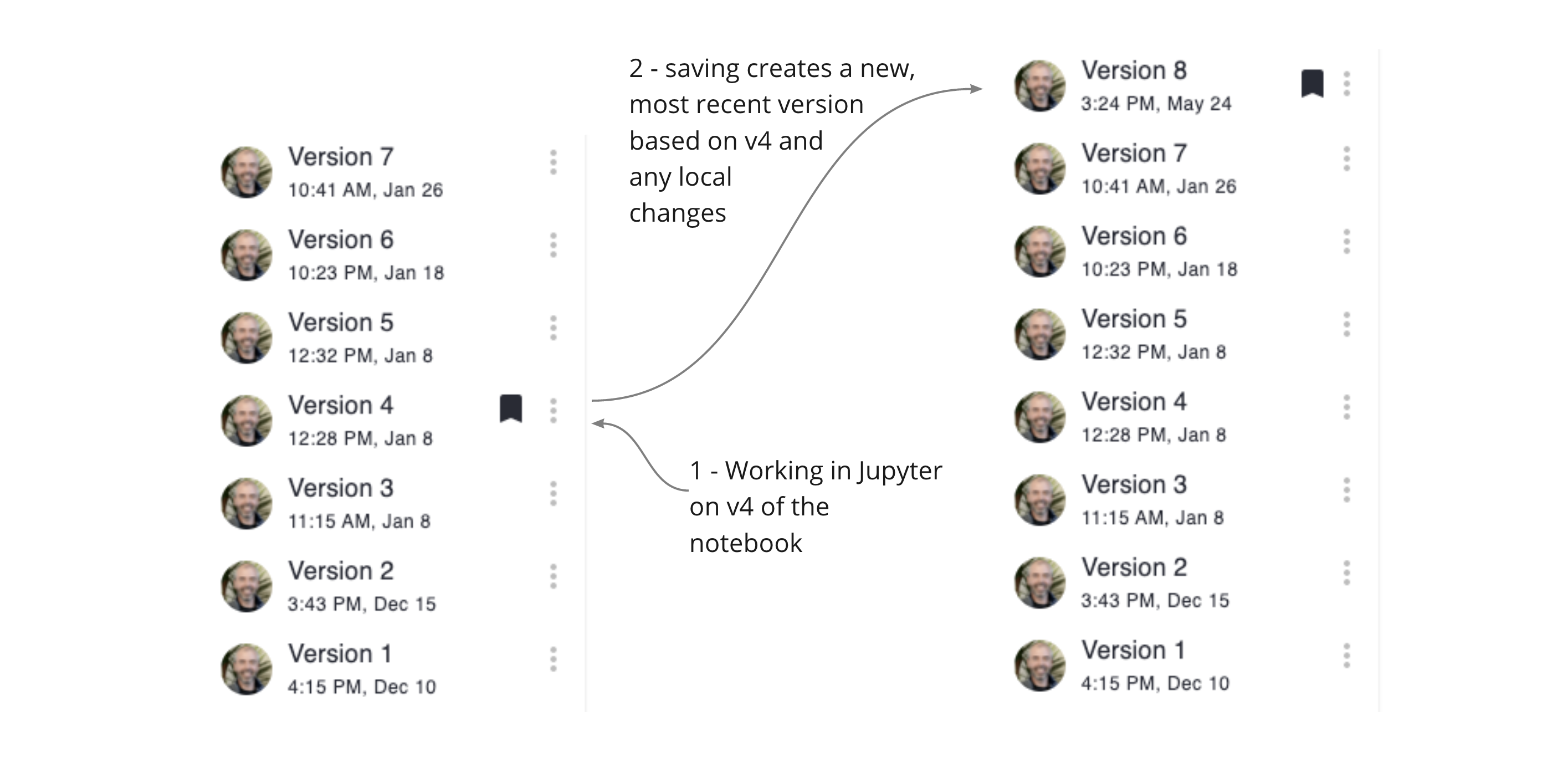 It is possible to revert to an earlier version of a notebook, make changes and save a new version — effectively “leap-frogging” changes into a new and most recent version. (This is a little like a rebase in git).